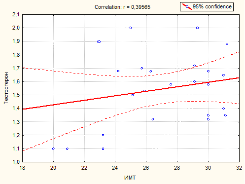 Рис. 3. Корреляция между уровнем тестостерона и ИМТ.