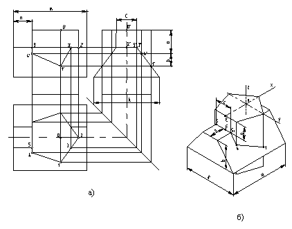 Горизонтальную и профильную проекции линии пересечения строят по точкам пересечения ребер одного многогранника с ребрами или гранями другого (рис. 11а).