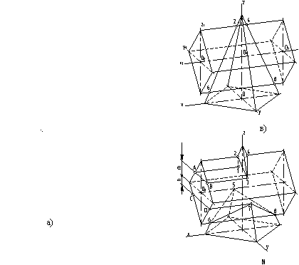 Точки 1, 3, 5 и 7 являются точками пересечения боковых ребер пирамиды с боковыми гранями призмы. Фронтальные проекции их очевидны, горизонтальные и профильные проекции этих точек находятся на соответствующих проекциях ребер пирамиды.