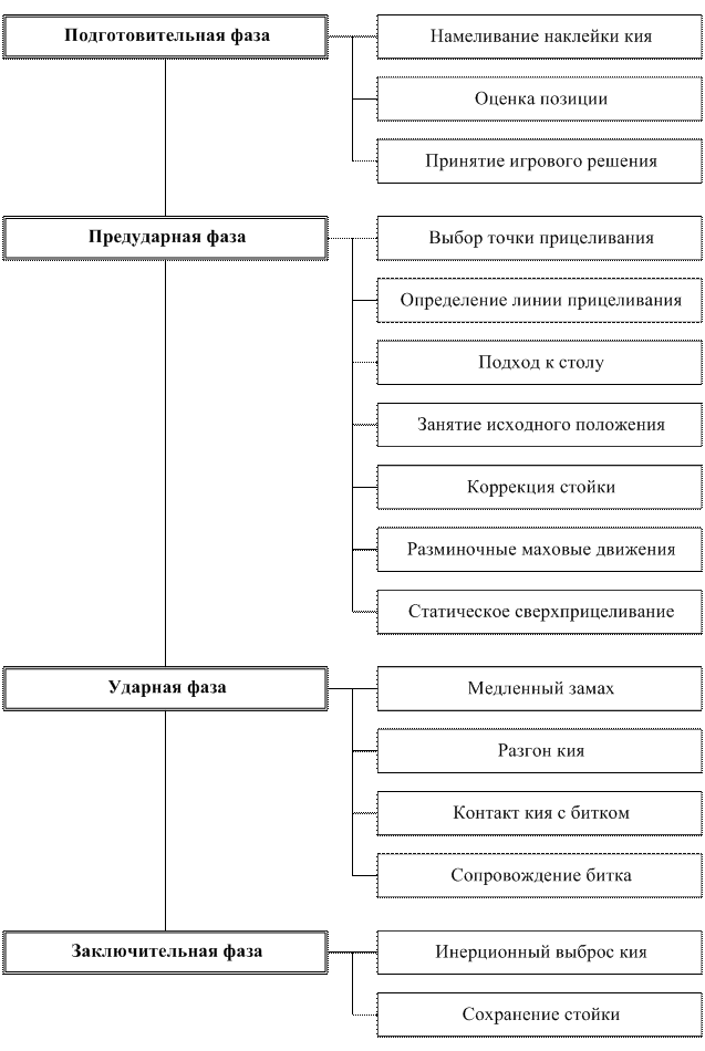 Проведенные нами теоретический анализ научно-методической литературы, обобщение собственного спортивного и тренерского опыта, опрос и педагогическое наблюдение позволили систематизировать накопленные знания в области технической подготовки спортсменов-бильярдистов, разработать структуру, определить фазовый состав техники бильярда (рис. 1, 2) и организовать экспериментальную работу для проверки и доказательства гипотезы исследования.
