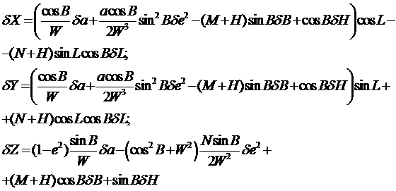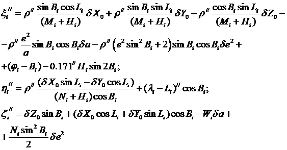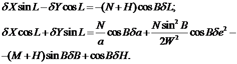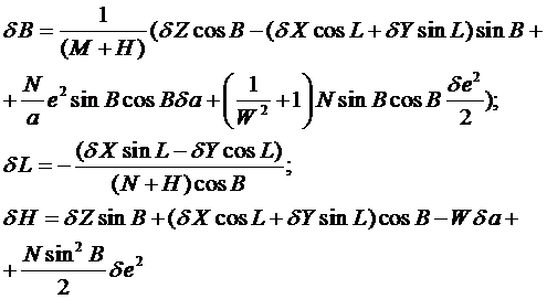 Это может быть выражено дифференциальными уравнениями, в которых дифференциалы параметров эллипсоида и геодезических координат заменены их конечными и малыми приращениями: