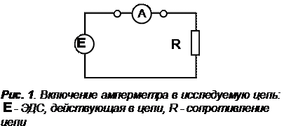 Для измерения силы тока применяют приборы, называемые амперметрами. В основе их работы лежит однозначная зависимость угла поворота стрелки индикатора (а, следовательно, и показаний прибора), соединенной с подвижным узлом, от величины силы тока, протекающего через измерительный узел прибора. Для измерения амперметры включают последовательно в разрыв цепи в том ее участке, где необходимо определить силу тока (рис.1).