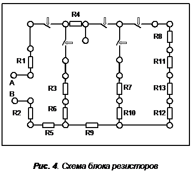При выполнении этого упражнения необходимо выполнить ряд измерений напряжения в цепи постоянного тока. Цепь состоит из постоянных резисторов, размешенных на учебной плате. Принципиальная схема блока представлена на рис.4. Установленные на плате кнопки в нормальном положении замкнуты. При нажатии они размыкают соответствующий участок цепи, что дает возможность измерить в нем силу тока, подключив а разрыв амперметр.