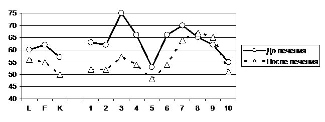 Восстановительное лечение благоприятно отразилось на психологическом статусе лиц, перенесших стрессорные расстройства в результате служебно-боевых действий. В результате изучения личностных характеристик испытуемых были выявлены три усредненных типа личностных профилей, которые изменились в результате нелекарственной коррекции этих состояний, что представлено на рис. 1-3.