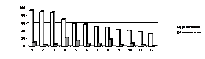 Так, критерий превышения рядов Фишера (относительно группы сравнения) составил для группы гомеопатии F=20,8; р=0,000084; для группы фитотерапии F=12,1; р=0,00035; для группы СКЭНАР терапии F=6,56; р=0,01073. При этом преимущество гомеопатии над фито - и СКЭНАР-терапии также подтверждалось достоверными значениями этого критерия (F=5,08; р=0,00208 и F=7,11; р=0,00036).
