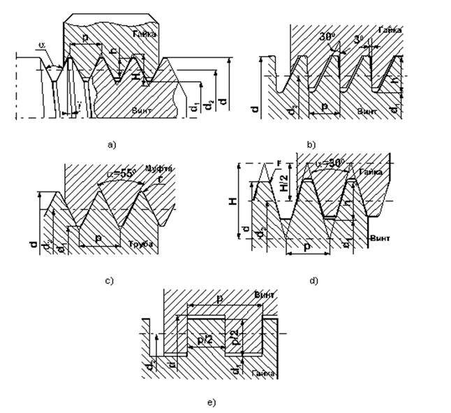 Контур сечения резьбы в плоскости, содержащей ось детали, называется профилем резьбы. Многообразие типов резьбы определяется выбором контура. По виду профиля в осевом сечении резьба делится на следующее типы (рис. 1.1, а - d):