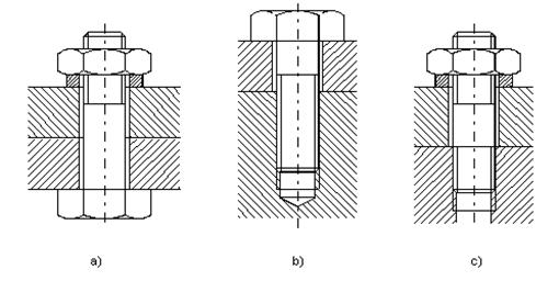 Типы резьбовых соединений. Прежде всего, это крепление винтом и гайкой (иногда пара винт-гайка называется болтом). Винт представляет собой стержень с головкой и одним резьбовым концом. Такой тип крепления используется для сборки деталей малой толщины (рис. 1.2, а).