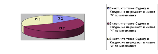 Для того чтобы выяснить, знают ли современные школьники, что такое магические квадраты, а так же Судоку и Какуро был проведен устный опрос. Было опрошено 50 человек относительно Магических квадратов. Опрос показал, что 3 человека знают и могут дать определение магического квадрата; 18 – слышали о магических квадратах; остальные 29 – понятия не имеют о чём идёт речь. Относительно Судоку и Какуро было опрошено 64 ученика этот опрос показал, что 12 человек знают, что такое Судоку и Какуро, при чём среди них 8 – имеют оценку "5" по математике, 4 – "4", и 2 – "3"; 13 человек знают, что такое Судоку и Какуро, но не решают их, причём имеют 2 – оценку "5", 7 –"4" и 4 – "3"; а остальные 39 не знают, что такое Судоку и Какуро и соответственно не решают, их оценки: 4 – "5", 14 – "4" и остальные 30 – "3". Этот опрос показал, что нынешняя молодёжь довольно мало интересуется решением занимательных задач и редко обращается к материалу, находящемуся за пределами школьной программы.
