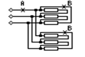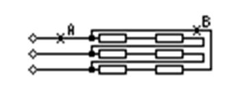 в) При обрыве фазы в точках В (см. рис.3) мы получаем, что два нагревателя не включены вообще, а остальные находятся под номинальным напряжением. Следовательно, число нагревателей в работе будет четыре.