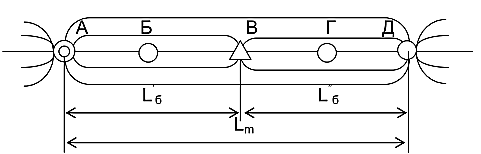 где Vy – участковая скорость движения поездов на участке обращения локомотивов; tтех – сумма времени стоянок поезда одного направления на технических станциях, расположенных внутри участка обращения локомотивов (в данном примере – это станции Б, В и Г); tос и tоб – время нахождения локомотива на станциях А основного и Д оборотного депо.