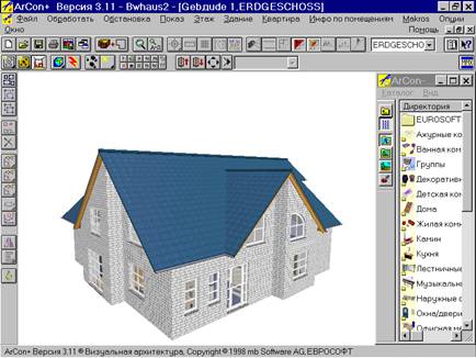 Для того, чтобы создать достаточно сложный проект, не требуется наличие специальных знаний в области CAD-систем. Достаточно просто разместить объекты, т. е. стены, двери, окна, лестницы и крышу на общем плане. ArCon предоставляет возможность планирования и конструирования произвольного количества этажей, включая подвальный и чердачный этажи. Этажи можно включать и выключать. Стены создаются как 3D-модель, пересечение стен строится автоматически. При этом с помощью специальной кнопки можно сразу же переключиться в режим просмотра проектируемого объекта в трехмерном пространстве. В режиме 3D просмотра можно проверить еще раз дизайн и оптимальную освещенность помещений с учетом реального времени суток. При этом не имеет никакого значения, идет ли речь о плане жилого дома на одну семью или большого административного комплекса.