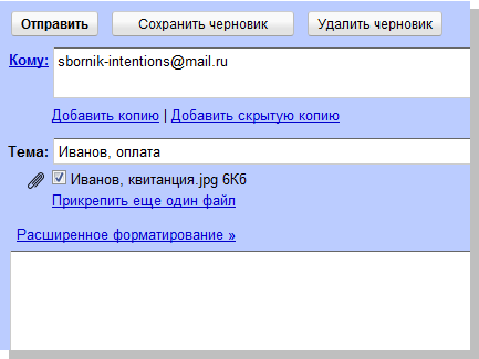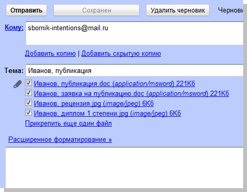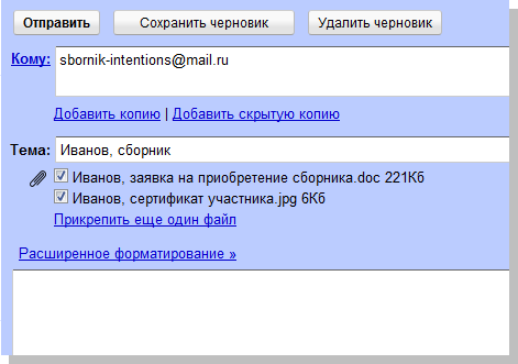 В теме письма следует указать через запятую фамилию автора и слово «сборник».