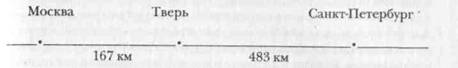Школьники догадываются, что нужно сложить расстояние от Санкт-Петербурга до Твери (483 км) и от Твери до Москвы (167 км). После выполнения указанного действия учитель спрашивает: