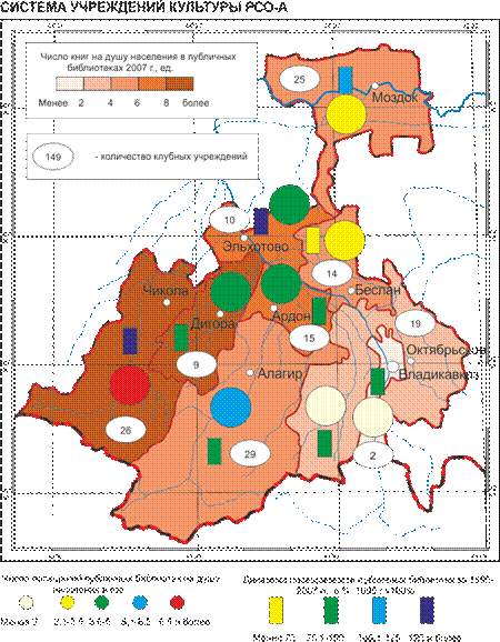 Таким образом, наивысший СКСИ в 2007 г. наблюдался во Владикавказе, а низкий – в Моздокском и Пригородном районе. Однако преобладание Владикавказа над остальными районами не столь значительно как можно было бы предположить. Это связано с низкими коэффициентами во Владикавказе в части К учителей, К посещаемости библиотек. Последний К города недопустимо низкий. Однако это можно объяснить, что при расчете данного коэффициента учитывались только библиотеки подчиненные Министерству культуры и не учитывались отраслевые библиотеки, каких во Владикавказе большинство (библиотеки вузов, НИИ, крупных предприятий, госархив и т. п.).