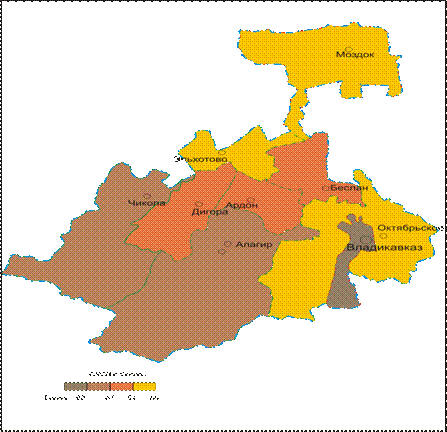 В целом районы Северной Осетии можно подразделить на несколько групп: 1) с очень высоким СКСИ (более 60 баллов) – Владикавказская администрация; 2) с высоким СКСИ (55-59 баллов) – Ирафский и Алагирский районы; 3) со средним СКСИ (54-50 баллов) – Правобережный, Дигорский и Ардонский районы; 4) с низким СКСИ (50-52 балла) – Кировский, Моздокский и Пригородный районы.