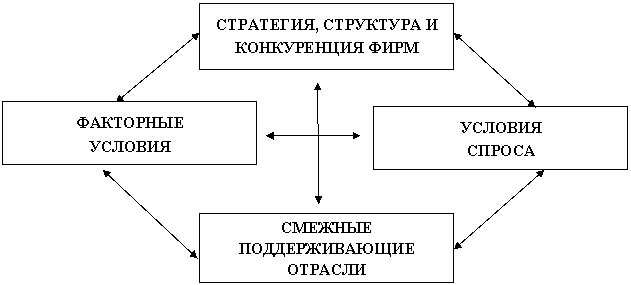 Содержание и направленность международных интеграционных процессов обосновывается в диссертации на базе классической теории интеграции, конкурентных и сравнительных преимуществ по М. Портеру, согласно которой конкурентное преимущество стран является результатом четырех взаимосвязанных расширенных факторов (схема 1):