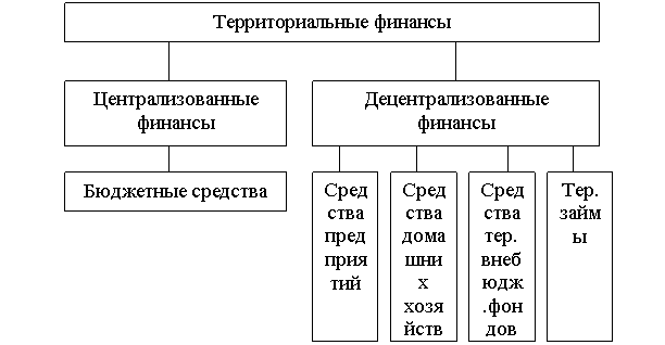 Таким образом, территориальные финансы включают два блока: централизованные финансы (бюджетные средства) и децентрализованные финансы (средства предприятий, средства домашних хозяйств, средства территориальных внебюджетных фондов, территориальные кредитные ресурсы).