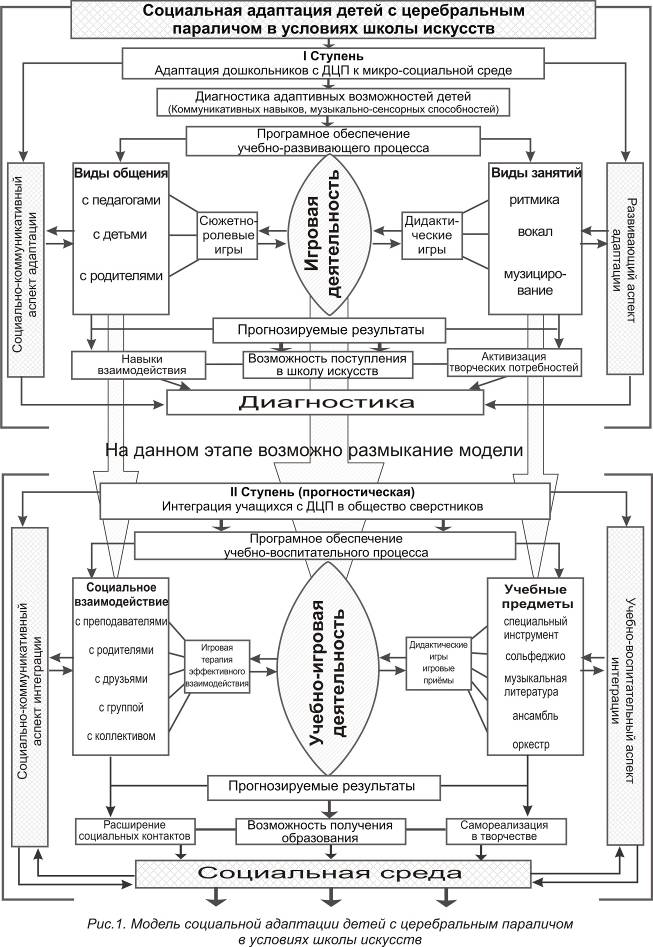1.Модель социальной адаптации предполагает включение детей с церебральным параличом в учебно-воспитательный процесс школы искусств. Реализация модели способствует раскрытию творческого потенциала детей данной категории, обеспечивает возможность самореализации в творческой деятельности и ориентирует на дальнейшее профессиональное обучение.