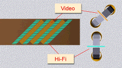 Высококачественный цифровой Hi-Fi звук записывается вместе с видеодорожками. Только для его записи используются отдельные головки на вращающемся блоке. Эти головки имеют зазор в сердечнике, соориентированный под другим углом, нежели в головках для записи видеосигнала, поэтому видеоголовки не реагируют на сигнал Hi-Fi звука, а головки, работающие со звуком, так же игнорируют видеосигнал.