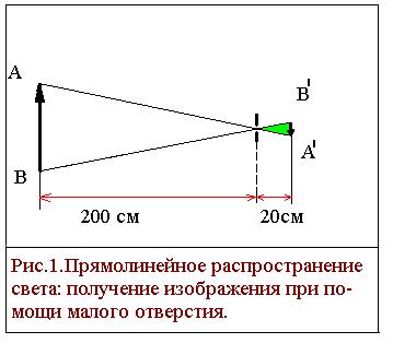 Опытным доказательством этого закона могут служить наблюдения над резкими тенями, даваемыми точечными источниками света, или получение изображений при помощи малых отверстий. Соотношение между контуром предмета и его тенью при освещении точечным источником (т. е. источником, размеры которого очень малы по сравнению с расстоянием до предмета) соответствует геометрическому проектированию при помощи прямых линий. Рис.1 иллюстрирует получение изображения при помощи малого отверстия, причем форма и размер изображения показывают, что проектирование происходит при помощи прямолинейных лучей.