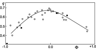 Рис. 1. Изменение параметра q в зависимости от фазы солнечного цикла (от максимума Φ = -1 до следующего максимума Φ = 1) по наблюдениям короны во время полных солнечных затмений с 1871 по 1961 гг. – пустые кружки (Несмянович, 1962, Астрон. журн. 39, 996). Черные квадратики – значения q в 23-м цикле по наблюдениям затмений.