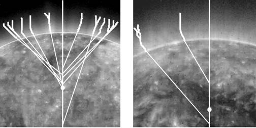 Рис. 2. Построение касательных к лучевым структурам и нахождения фокуса для периода минимума (слева) и максимума (справа) солнечной активности. Изображения SOHO/ EIT 171 Å 13 февраля 1997 г. в 20:01 UT и 29 сентября 2000 г. в 19:09 UT. Жирные ломаные линии – траектории поиска осевых линий лучей, тонкие линии – экстраполяции траекторий (касательные к лучам), вертикальная линия – ось вращения Солнца, белый кружок – магнитный фокус. (SOHO – совместный проект ESA и NASA).