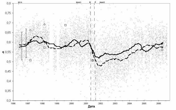 Рис. 3. Распределение величин q со временем в течение 23 цикла и график усредненных по 200-м точкам значений q для северной (сплошная линия) и южной (пунктир) полусфер с доверительным интервалом ± σ. Сверху отмечено положение минимума активности, первого и второго максимума пятен. Вертикальные пунктирные линии N и S показывают моменты переполюсовки в северном и южном полушарии. Значения q, найденные той же программой по снимкам короны во время затмений, показаны квадратиками для северной полусферы и кружками – для южной.