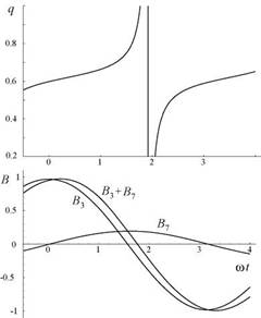 Во втором параграфе получено выражение для q в поле, представляющем собой сумму двух сферических гармоник разных степеней. Показано, что для поля, составленного из двух гармоник, имеющих противоположные полярности на полюсе, значение q может быть меньшим, чем q для каждой их них в отдельности. Это, в принципе, снимает противоречие, о котором говорится в предыдущем параграфе.