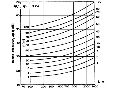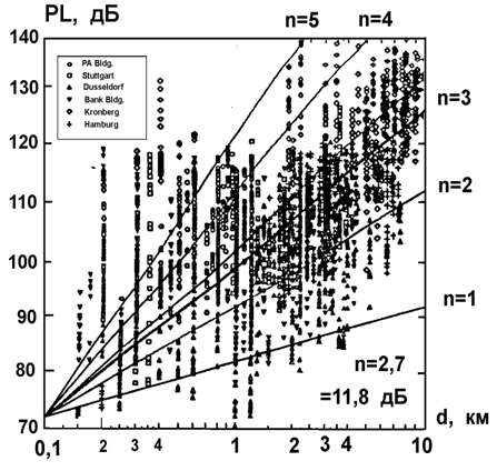 Опорное расстояние d0 обычно выбирается равным 100 м или 1 км для связи вне зданий. Для радиоканалов внутри зданий типичное значение опорного расстояния d 0 = 1 м.
