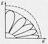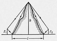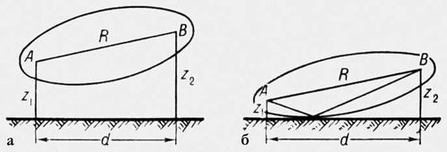 . Чем меньше l, тем уже эллипсоид, в оптическом диапазоне он вырождается в прямую линию (световой луч). Если высоты Z1 и Z2, на которых расположены антенны передатчика и приёмника относительно поверхности Земли, велики по сравнению с l, то эллипсоид не касается поверхности Земли (рис. 1, а). Поверхность Земли не оказывает в этом случае влияния на Р. р. (свободное распространение). При понижении обеих или одной из конечных точек радиотрассы эллипсоид коснётся поверхности Земли (рис. 1, б) и на прямую волну, идущую от передатчика к приёмнику, належится поле отражённой волны. Если при Z1 >> l и Z2 >> l, то это поле можно рассматривать как луч, отражённый земной поверхностью по законам геометрической оптики. Поле в точке приёма определяется интерференцией прямого и отражённого лучей. Интерференционные максимумы и минимумы обусловливают лепестковую структуру поля (рис. 2). Условие Z1 и Z2 >> l практически может выполняться только для метровых и более коротких волн, поэтому лепестковая структура поля характерна для ультракоротких волн (УКВ).