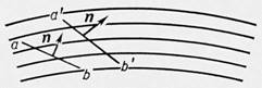 Распространение радиоволн в тропосфере. Рефракция радиоволн. Земные радиоволны распространяются вдоль поверхности Земли в тропосфере. Проводимость тропосферы s для частот, соответствующих радиоволнам (за исключением миллиметровых волн), практически равна 0; диэлектрическая проницаемость e и, следовательно, показатель преломления n являются функциями давления и температуры воздуха, а также давления водяного пара. У поверхности Земли n » 1,0003. Изменение e и n с высотой зависит от метеорологических условий. Обычно e и n уменьшаются, а фазовая скорость u растет с высотой. Это приводит к искривлению радиолучей (рефракция радиоволн, рис. 9). Если в тропосфере под углом к горизонту распространяется волна, фронт которой совпадает с прямой ав (рис. 9), то вследствие того, что в верхних слоях тропосферы волна распространяется с большей скоростью, чем в нижних, верхняя часть фронта волны обгоняет нижнюю и фронт волны поворачивается (луч искривляется). Т. к. n с высотой убывает, то радиолучи отклоняются к Земле. Это явление, называется нормальной тропосферной рефракцией, способствует Р. р. за пределы прямой видимости, т. к. за счёт рефракции волны могут огибать выпуклость Земли. Однако практически этот эффект может играть роль только для УКВ, поскольку для более длинных волн преобладает огибание в результате дифракции. Метеорологические условия могут ослаблять или усиливать рефракцию по сравнению с нормальной.
