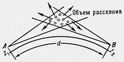 Рис. 10. Схематическое изображение линии радиосвязи, использующей рассеяние радиоволн на неоднородностях тропосферы.