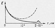 Рис. 16. Зависимость напряженности Е поля волны от расстояния до передатчика r в отсутствии поглощения (пунктир) и при учете поглощения.