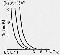 Рис. 18. Зависимость потерь энергии за счет вращения плоскости поляризации волны от частоты для трех значений угла возвышения b.