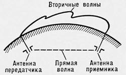 Выпуклость Земли является своеобразным «препятствием» на пути радиоволн, которые, дифрагируя, огибают Землю и проникают в «область тени». Т. к. дифракция волн заметно проявляется тогда, когда размеры препятствия соизмеримы или меньше l, а размер выпуклости Земли можно охарактеризовать высотой шарового сегмента h (рис. 4), отсекаемого плоскостью, которая проходит через хорду, соединяющую точки расположения приёмника и передатчика (см. табл.), то условие h << l выполняется для метровых и более длинных волн. Если учесть, что с уменьшением l увеличиваются потери энергии в Земле, то практически только километровые и более длинные волны могут проникать глубоко в область тени (рис. 5).