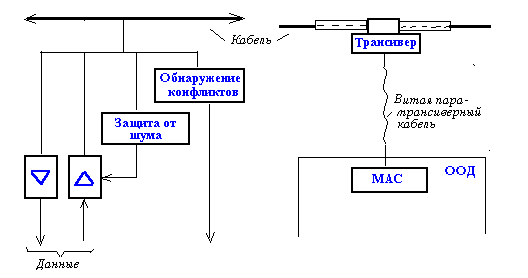 Приемопередатчик ПП (transiver) - устройство для электрического соединения АКД с линией передачи данных. В состав приемопередатчика (рис. 4.2) в магистральных ЛВС с методом МДКН/ОК входят: