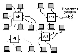 3. Вариант Twisted Pair Ethernet (топология "звезда"); принятое обозначение 10Base-Т; это кабельная сеть с использованием витых пар проводов и концентраторов, называемых также распределителями, или хабами (Hubs). Представление о структуре сети может дать рис. 4.3. В состав сетевого оборудования входят активные (AH) и пассивные (PH) распределители (Active and Passive Hubs), различие между которыми заключается в наличии или отсутствии усиления сигналов и в количестве портов. В одной из разновидностей сети 10Base-T допускаются расстояния между активными распределителями до 600 м и между пассивными до 30 м, предельное число узлов 100. Физическая организация линий связи в 10Base-T мало напоминает шину. Однако в такой сети вполне возможна реализация метода доступа МДКН/ОК, и для пользователя (любого отдельного узла) разветвленная сеть из витых пар и концентраторов, по которой происходит широковещательная передача, есть просто среда передачи данных, такая же, как шина. Поэтому по логической организации сеть 10Base-T есть сеть типа Ethernet. В то же время по своей топологии 10Base-T может быть вариантом "звезда", "дерево" и т. п. В этой сети не рекомендуется включать последовательно более 4-х хабов.