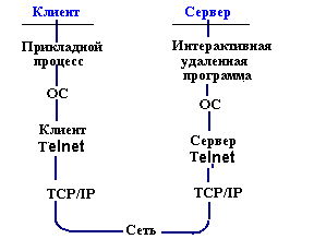 Telnet должен иметь возможность работать в условиях разных аппаратных платформ клиента и сервера. Это требование выполняется через промежуточный виртуальный терминал (аналогично SQL сервису в ODBC). В терминале зафиксирована интерпретация различных символов управления, поскольку их разновидностей не так уж много.