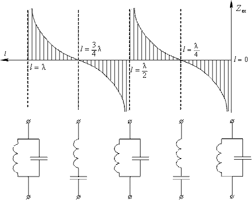 от конца линии ток снова равен нулю, а напряжение максимально. В этом случае сопротивление отрезка становится равным бесконечности, а эквивалентная схема может быть представлена параллельным колебательным контуром. В промежутках между точками