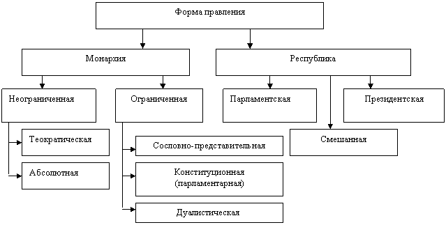 По форме правления государства подразделяются на монархии (единоличные, наследственные) и республики (коллегиальные, выборные).