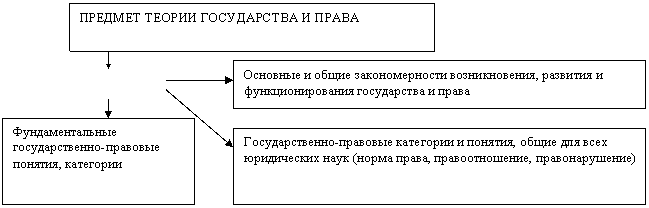 Таким образом, предмет теории государства и права составляют основные и общие закономерности возникновения, развития и функционирования государства и права, а также систематизированные сведения об основных понятиях и категориях юриспруденции.
