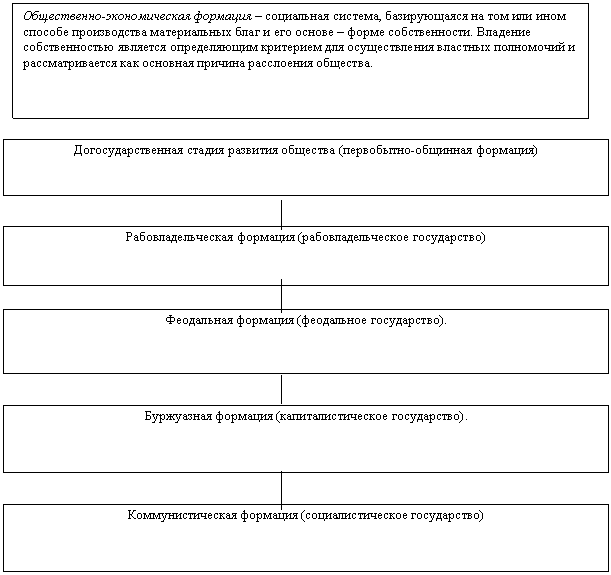 Отмечая множественность точек зрения, связанных с рассмотрением проблемы типологии государства, следует выделить два основных научных подхода: формационный и цивилизационный. Суть первого (формационного) заключается в понимании государства как системы взаимосвязанных экономических (базисных) отношений, предопределяющих формирование надстройки, объединяющей социальные, политические, идеологические отношения. Сторонники данного подхода рассматривают государство как специфический социальный орган, возникающий и отмирающий на определенном этапе развития общества – социально-экономической формации. Деятельность государства при этом носит преимущественно принудительный характер и предполагает силовые методы разрешения классовых противоречий, возникающих вследствие конфликта между передовыми производительными силами и отсталыми производственными отношениями. Основными историческими типами государств в соответствии с формационным подходом являются государства эксплуататорского типа (рабовладельческие, феодальные, буржуазные), характеризуемые наличием частной собственности (рабы, земля, средства производства, прибавочный капитал) и непримиримыми (антагонистическими) противоречиями между классом угнетателей и классом угнетенных. Нетипичным для формационного подхода является социалистическое государство, возникающее в результате победы пролетариата над буржуазией и знаменующее собой начало перехода от буржуазной к коммунистической (безгосударственной) общественно-экономической формации. В социалистическом государстве на смену частной собственности на средства производства приходит собственность государственная (общенародная); противоречия между классами перестают носить антагонистический характер; имеет место тенденция к слиянию основных классов (рабочих, крестьян, прослойки трудовой интеллигенции) и образованию единой социально-однородной общности – советских людей; государство продолжает оставаться «силовым механизмом принуждения», однако меняется направленность мер принудительного характера – из аппарата порабощения одним классом другого, государство превращается в инструмент обеспечения и защиты интересов сообщества на международной арене, гарантии законности и правопорядка в самом государстве. Отмечая положительные черты данного подхода следует прежде всего отметить его конкретность, позволяющую достаточно четко обозначить основные исторические типы государственно-правовых систем. В качестве негативной стороны указать на догматичность (учение Маркса всесильно, потому что верно) и односторонность формационной типологии, принимающей за основу типологизации только экономический критерий.