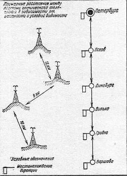 Первый оптический телеграф построили в 1794 г. во Франции, между Парижем и Лиллем. Самая длинная линия – 1200 км –действовала в середине ХIХ в. между Петербургом и Варшавой. Линия имела 149 башен. Ее обслуживали 1308 человек. Сигнал по линии проходил из конца в конец за 15 минут.