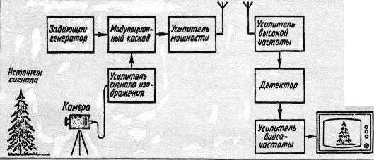 Схема телевидения в основном совпадает со схемой радиовещания. Разница заключается в том, что в передатчике колебания модулируются не только звуковыми сигналами, но и сигналами изображения. Оптические сигналы в передающей телекамере преобразуются в электрические. Модулированная электромагнитная волна переносит информацию на большие расстояния.