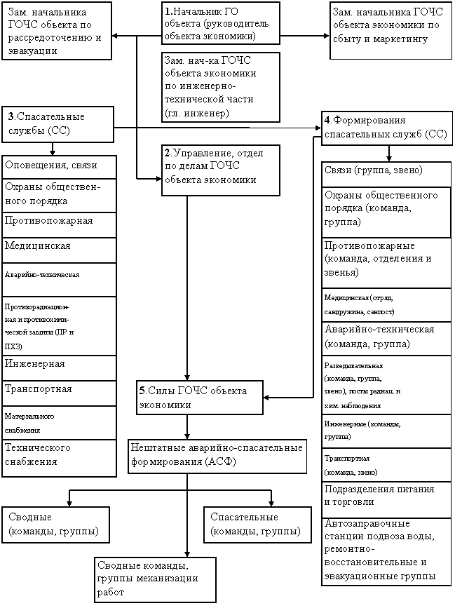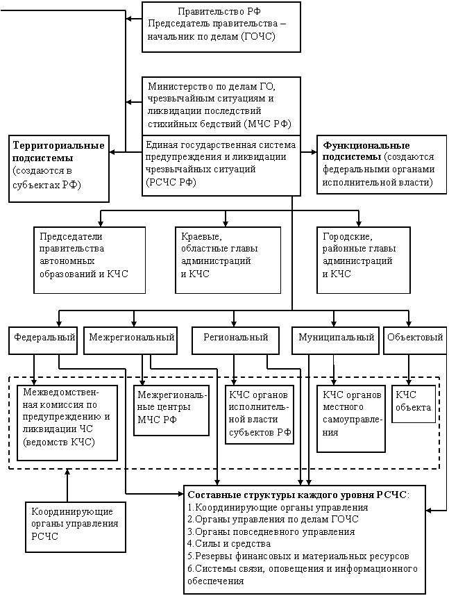 Организация ликвидации ЧС зависит от их характера и масштаба, а также от последствий. Для организации АС и ДНР по ликвидации последствий аварий (А), катастроф (К) и стихийных бедствий (СБ) создаются комиссии по предупреждению и ликвидации ЧС и обеспечению пожарной безопасности (КЧС), которые являются функциональными структурами органов исполнительной власти и органа управления объектом экономики (ОЭ) (рис. 1, 2, 6). КЧС образованы: на федеральном уровне; на региональном уровне (в пределах территории субъекта РФ) – КЧС органа исполнительной власти субъекта РФ; на муниципальном уровне (в пределах территории муниципального образования); на объектовом уровне. КЧС возглавляются руководителями указанных органов исполнительной власти и организаций или их заместителями. Членами комиссии являются ведущие специалисты соответствующих органов исполнительной власти и организаций по вопросам обеспечения жизнедеятельности населения.