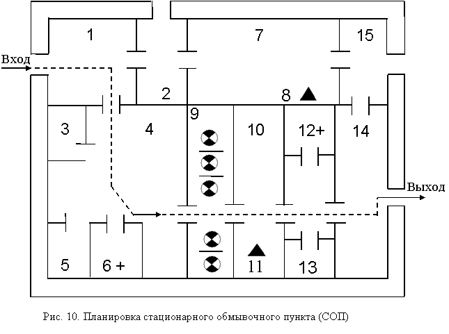 1 – раздевалка; 2 – помещение для загрязненной одежды и подготовка ее к обеззараживанию; 3, 13 – санузлы; 4 – смотровое помещение; 5 – склад для загрязненной одежды; 6, 12 – медпункты; 7 – помещение для обеззараживания; 8, 11 – пункты дозиметрического контроля; 9 – душевые; 10, 14 – помещения для ожидания и одевания; 15 – помещение для чистой одежды.