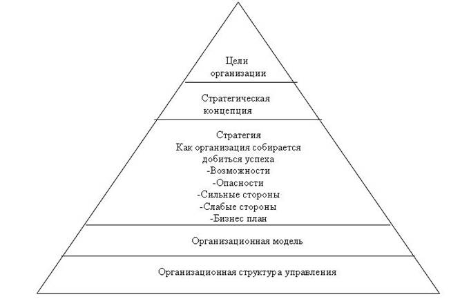 Таким образом, структура неразрывно связана со стратегией. Одно время практиковался статический подход к разработке проекта организации и корректирующих изменений. Определялись задачи текущей деятельности предприятия, которые затем агрегировали по восходящим уровням в форме традиционной пирамиды. Теперь же ни одна организационная схема большого предприятия не может основываться только на текущей деятельности. Она обязательно должна отражать любые возможные изменения главной задачи предприятия, цели и стратегические программы высшего руководства.