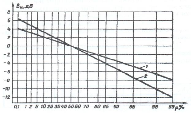 Ви – коэффициент, учитывающий интерференционные замирания (флюктуации) сигналов в каналах станционной радиосвязи и зависящий от принятой надежности канала по полю, определяется по графикам функции распределения уровней напряженности поля (см. приложение 1): кривая 1 – для автономной тяги, кривая 2 – для электрифицированных участков;