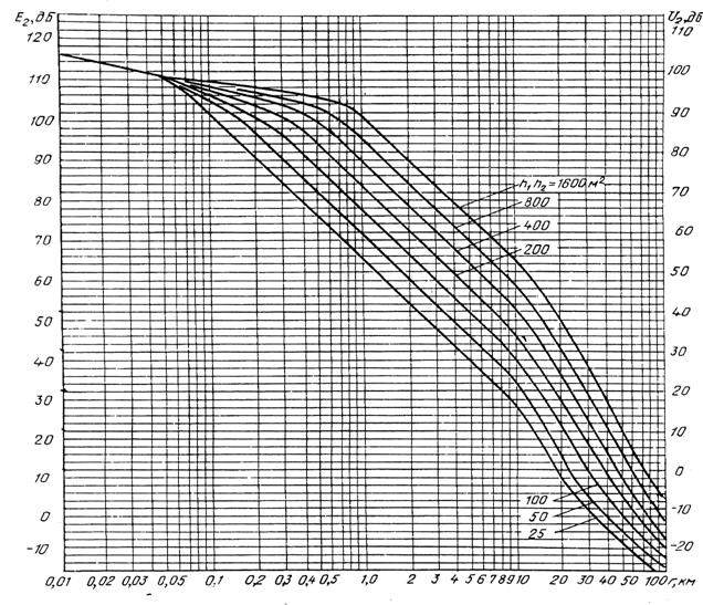 h1h2 = 25 м2. По графикам находим дальность связи РВ-РВ Д @ 0,8 км.
