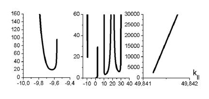где θ - угол между направлением от источника в точку наблюдения и магнитным полем. Далее первое из соотношений (1) позволяет определить значения продольных волновых чисел для волн, существующих в окрестности точки наблюдения. В качестве примера на Рис.1 изображена ∂k┴/∂k║ от k║ (нормированной на ωp /с) для необыкновенной волны при ω = ωp, ωH = 3ωp, V/c = 0,1, где ωp и ωH – плазменная и гирочастоты.